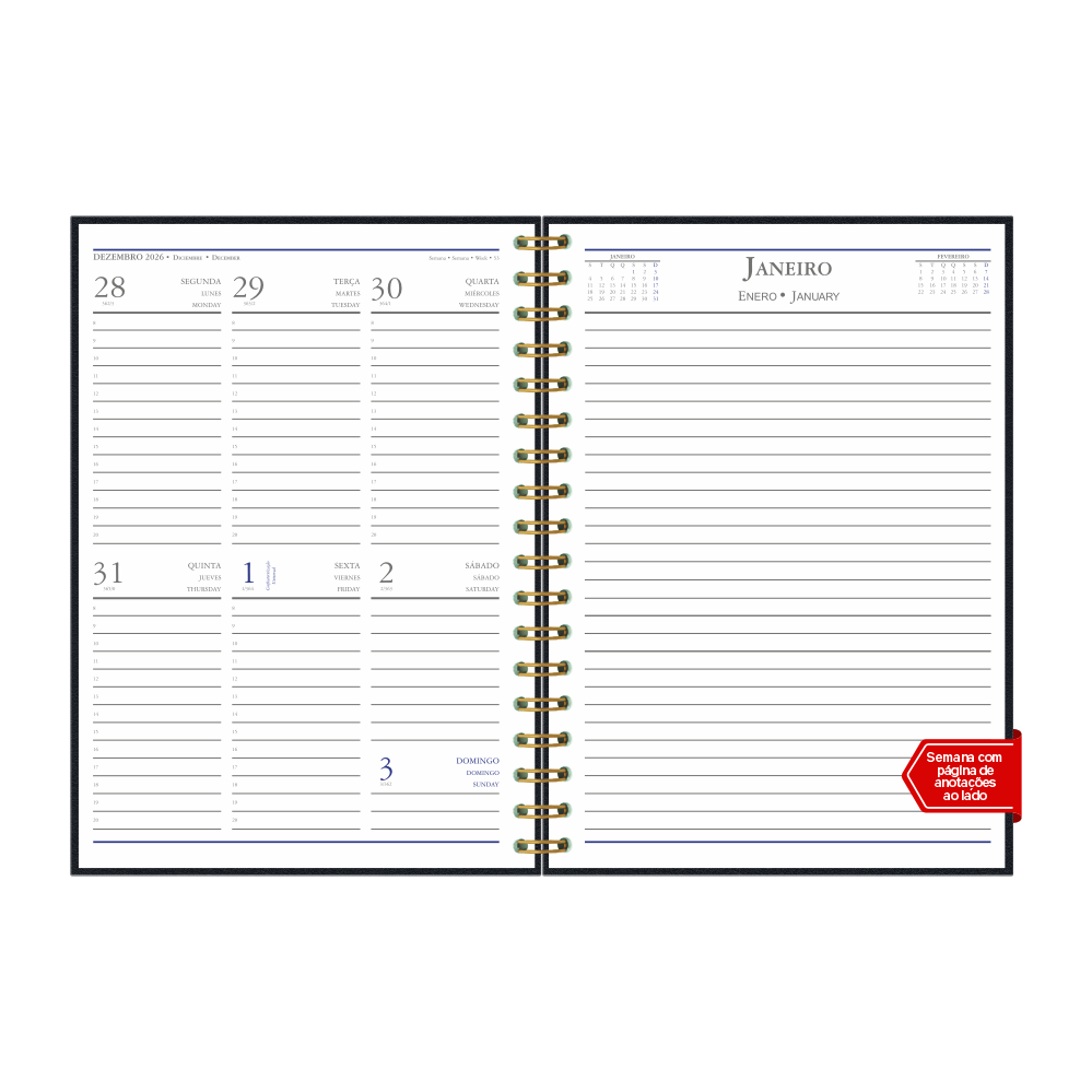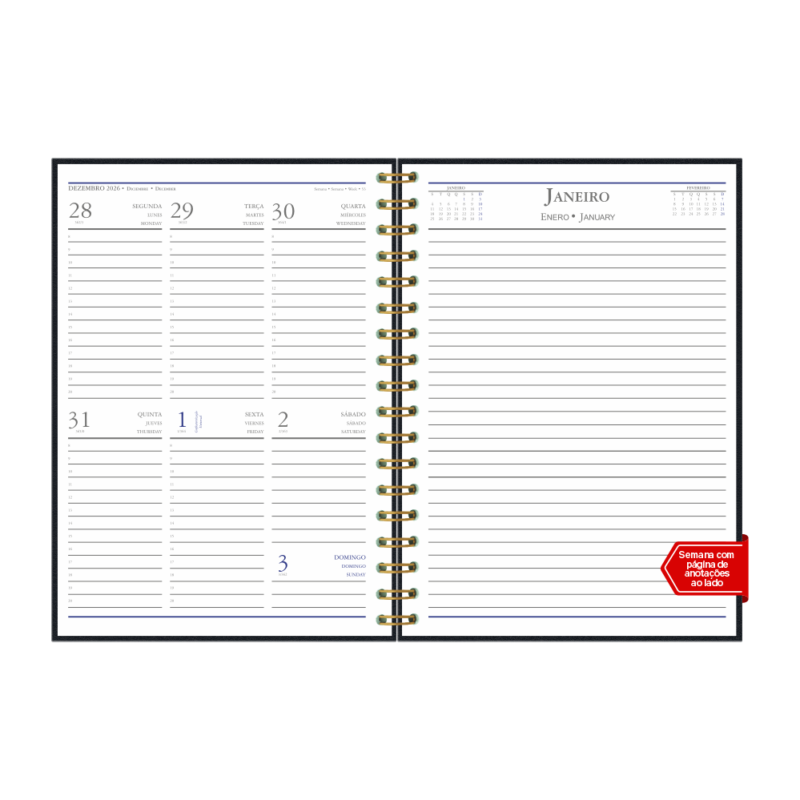 • miolo com visão semanal em 3 idiomas